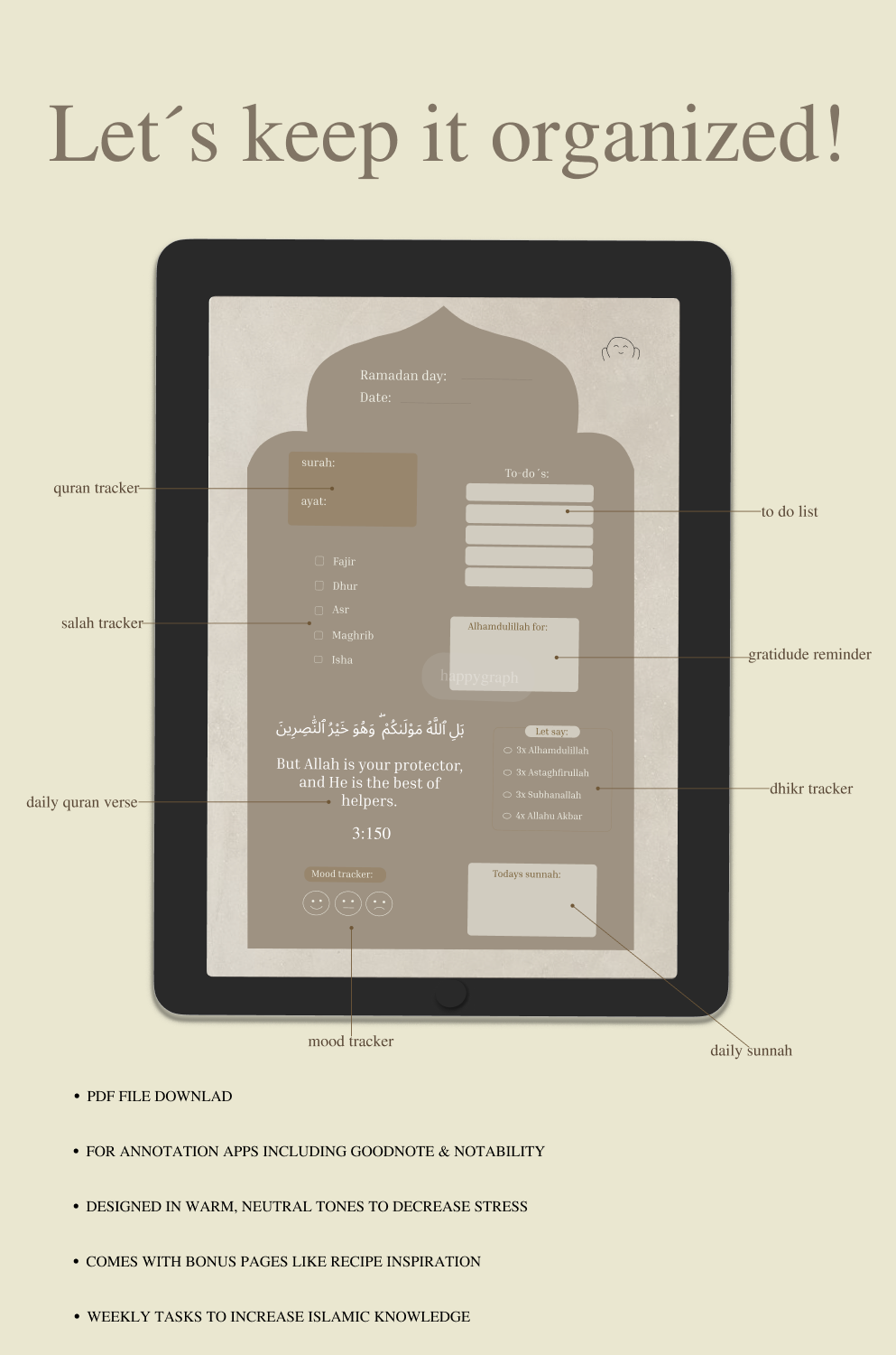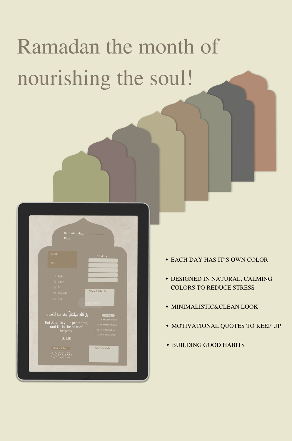 It's designed to help you make the most of your spiritual journey during Ramadan. I designed the planner in natural colors to reduce stress. So, grab your planner, embrace the beauty of Islam and have a fulfilling Ramadan!
